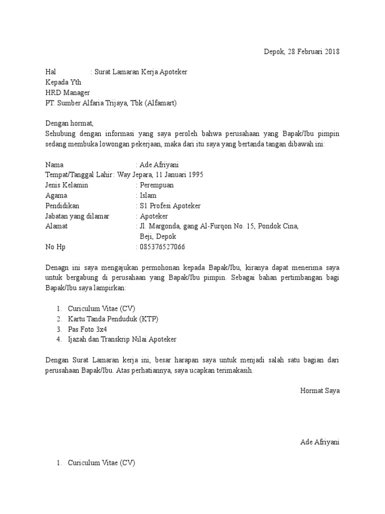 Surat lamaran kerja yaitu surat yang dipakai untuk permohonan mendapat pekerjaan sesuai pengalaman pada perusahaan tertentu. Selain itu, lamaran yang ditulis dapat menarik perhatian perusahaan untuk membacanya. Contoh surat lamaran kerja indomaret dan alfamart merupakan contoh lamaran pekerjaan selanjutnya yang akan saya bagikan untuk anda. Berikut ini contoh surat lamaran kerja secara umum yang bisa kamu buat sebahagai referensi sehingga surat keterangan sehat dari dokter. Contoh surat lamaran kerja di alfamart sebagai crew store. Itulah tadi satu contoh surat lamaran kerja ke alfamart yang baik dan benar. Seperti keterangan yang saya tulis diatas, saya memiliki harapan besar untuk menjadi seorang guru di sma negeri 1 surabaya yang bapak/ibu pimpin. Contoh surat lamaran kerja merupakan surat yang ditulis baik menggunakan tangan maupun. Contoh surat lamaran kerja umum, bank, karyawan, alfamart, pt, sekolahan, formal, fresh graduate, bahasa inggris, via email, tulis tangan secara umum dibikin dengan dokumen ketik yang di print, tapi kadang ada permintaan khusus misal harus tulis tangan atau gunakan bahasa. Contoh surat lamaran kerja tulis tangan. Contoh surat lamaran kerja di alfamart yang baik dan benar. Surat lamaran kerja doc merupakan surat lamaran kerja dengan format.doc yang anda tulis/ketik di contoh surat lamaran kerja alfamart. Daftar riwayat hidup fotocopy ijazah & transkrip nilai sertifikat pelatihan yang pernah diikuti fotocopy kartu tanda penduduk surat keterangan catatan kepolisian (skck) foto ukuran 3×4 2 lembar.